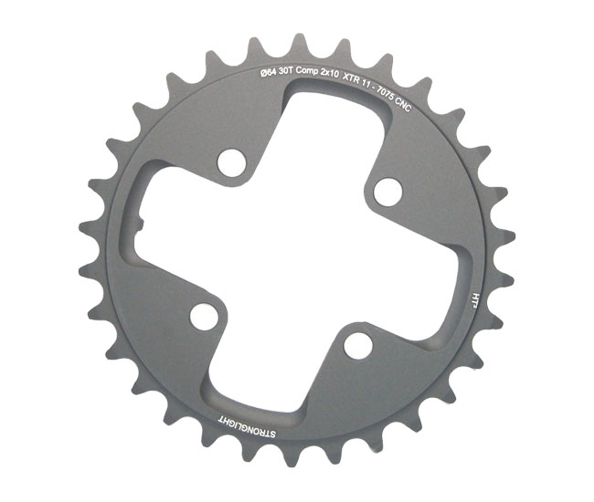 Die Stronglight HT3 Kettenblaetter sind aus hochwertigem 7075 Aluminium CNC gefraest und Titanoxid-Elektrokeramischen Beschichtung behandelt fuer eine lange Lebenszeit. Der Reibungs- und Abrieb Koeffizient wurde deutlich reduziert, 0.2-0.3, und biete eine Geraeuschminderung sowie eine ausgezeichnete Korrosionsbestaendigkeit. Ausgestattet mit Schalthilfen gefertigt sind diese Kettenblaetter ein gleichwertiger und preiswerter Ersatz fuer die orginal Shimano XTR Kettenblaetter