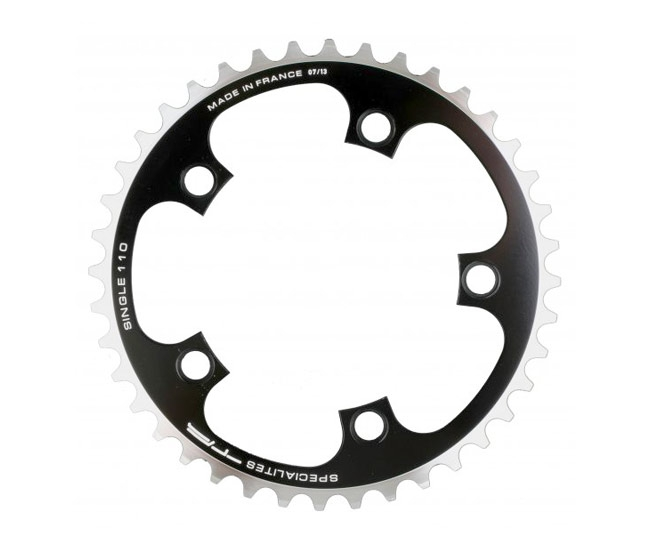 Die Singel Kettenblaetter von TA Specialite ohne Schaltweichen. Diese Kettenblaetter sind ausgelegt fuer Singel Speed Bikes, Rohloff oder Shimano Getriebenaben und Tandems. Die Kettenblaetter koennen an alle Kurbeln mit 110 er Lochkreis montiert werden.