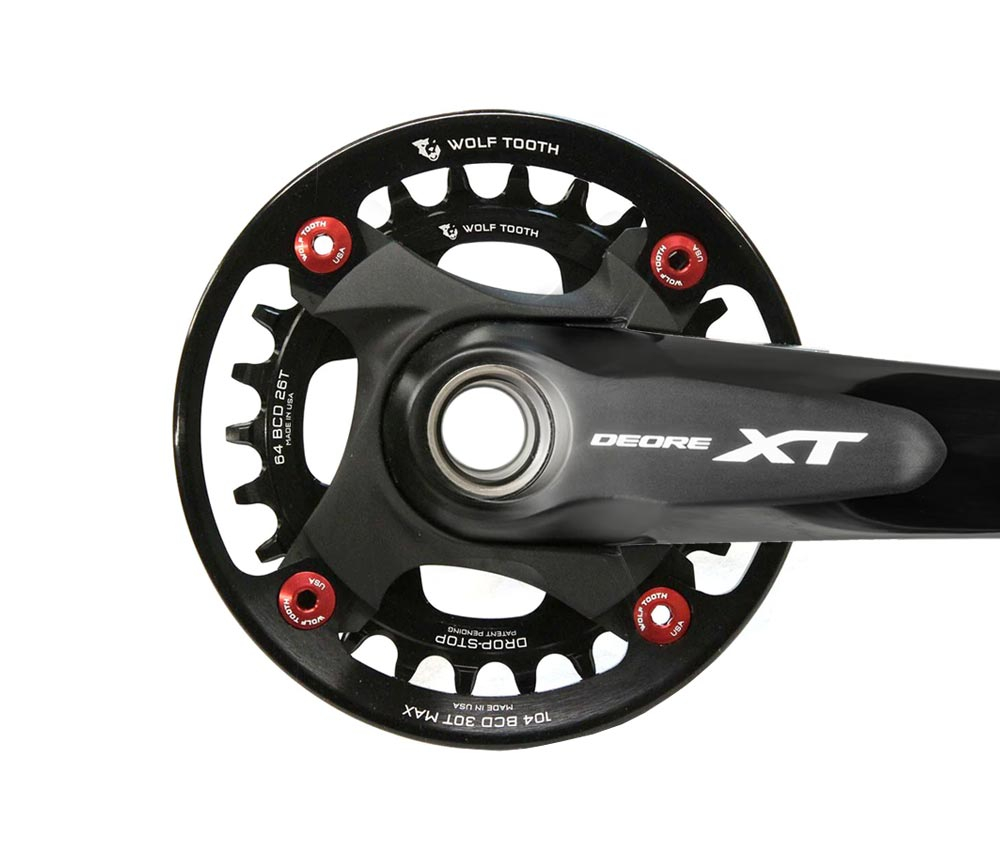 Der Wolf Tooth Kettenschutzring fuer 1-fach Kettenblaetter mit 104mm Lochkreis und 32-34 Zaehnen. Gefertigt aus hochfestem 7075 T6 Aluminium ist er nicht nur leicht, sondern es lassen sich auch 1, 2 oder 3-fach Kurbeln nachzuruesten um die Kettenblaetter vor Schmutz zu schuetzen.