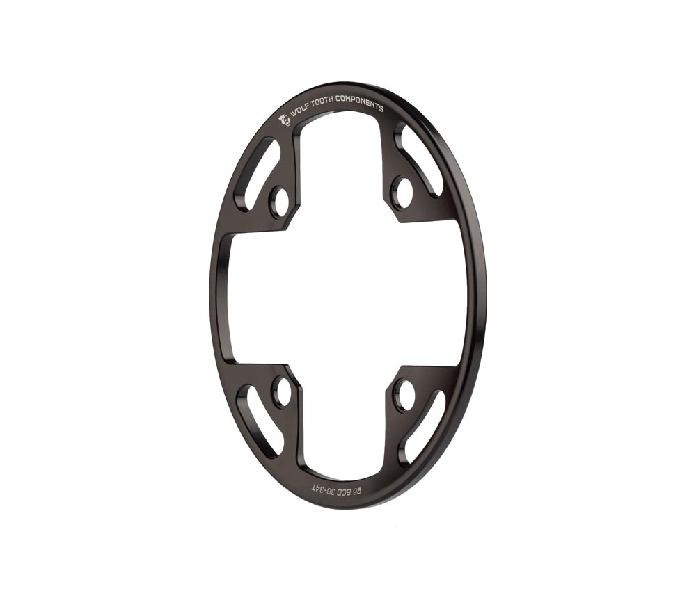 Der Wolf Tooth Kettenschutzring fuer 1-fach Kettenblaetter mit 104mm Lochkreis und 32-34 Zaehnen. Gefertigt aus hochfestem 7075 T6 Aluminium ist er nicht nur leicht, sondern es lassen sich auch 1, 2 oder 3-fach Kurbeln nachzuruesten um die Kettenblaetter vor Schmutz zu schuetzen.