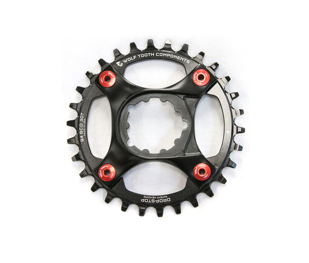 Das patentierte Drop Stop A Narrow-Wide-Zahnprofil von Wolf Tooth bietet die ultimative Kettenfuehrung und Selbstreinigung. Die rechte Seite des Zahns ist so breit wie moeglich, um die Kontaktflaeche zur Kette zu maximieren. Mehr Kontaktflaeche bedeutet, dass die Belastung auf einer groesseren Flaeche verteilt wird, was wiederum den Verschleiss reduziert. Die linke Seite des Zahns ist schmaler als der Rollenstift der Kette, darum hat Wolf Tooth zusaetzliches Material entfernt, um einen Kanal zu schaffen damit Schmutz abfliessen kann. Mehr Kontaktflaeche und Platz bedeutet wiederum eine geringere Wahrscheinlichkeit das die Kette beim fahren durch Schmutz herunterfaellt.