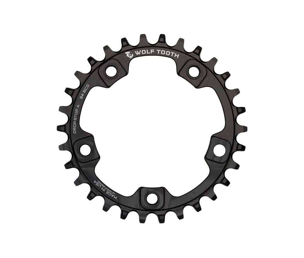 Das patentierte Drop Stop A Narrow-Wide-Zahnprofil von Wolf Tooth bietet die ultimative Kettenfuehrung und Selbstreinigung. Die rechte Seite des Zahns ist so breit wie moeglich, um die Kontaktflaeche zur Kette zu maximieren. Mehr Kontaktflaeche bedeutet, dass die Belastung auf einer groesseren Flaeche verteilt wird, was wiederum den Verschleiss reduziert. Die linke Seite des Zahns ist schmaler als der Rollenstift der Kette, darum hat Wolf Tooth zusaetzliches Material entfernt, um einen Kanal zu schaffen damit Schmutz abfliessen kann. Mehr Kontaktflaeche und Platz bedeutet wiederum eine geringere Wahrscheinlichkeit das die Kette beim fahren durch Schmutz herunterfaellt.