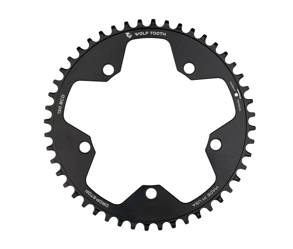 Das patentierte Drop Stop B Narrow-Wide-Zahnprofil von Wolf Tooth bietet die ultimative Kettenfuehrung und Selbstreinigung. Die rechte Seite des Zahns ist so breit wie moeglich, um die Kontaktflaeche zur Kette zu maximieren. Mehr Kontaktflaeche bedeutet, dass die Belastung auf einer groesseren Flaeche verteilt wird, was wiederum den Verschleiss reduziert. Die linke Seite des Zahns ist schmaler als der Rollenstift der Kette, darum hat Wolf Tooth zusaetzliches Material entfernt, um einen Kanal zu schaffen damit Schmutz abfliessen kann. Mehr Kontaktflaeche und Platz bedeutet wiederum eine geringere Wahrscheinlichkeit das die Kette beim fahren durch Schmutz herunterfaellt.