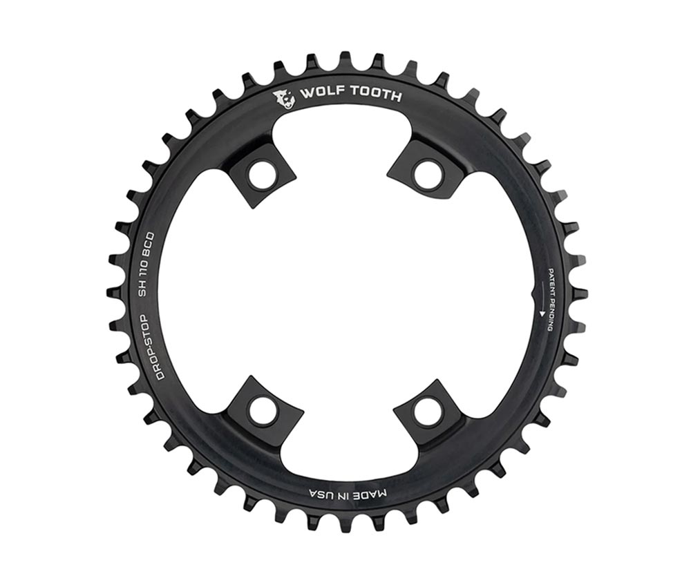 Das patentierte Drop Stop B Narrow-Wide-Zahnprofil von Wolf Tooth bietet die ultimative Kettenfuehrung und Selbstreinigung. Die rechte Seite des Zahns ist so breit wie moeglich, um die Kontaktflaeche zur Kette zu maximieren. Mehr Kontaktflaeche bedeutet, dass die Belastung auf einer groesseren Flaeche verteilt wird, was wiederum den Verschleiss reduziert. Die linke Seite des Zahns ist schmaler als der Rollenstift der Kette, darum hat Wolf Tooth zusaetzliches Material entfernt, um einen Kanal zu schaffen damit Schmutz abfliessen kann. Mehr Kontaktflaeche und Platz bedeutet wiederum eine geringere Wahrscheinlichkeit das die Kette beim fahren durch Schmutz herunterfaellt.
