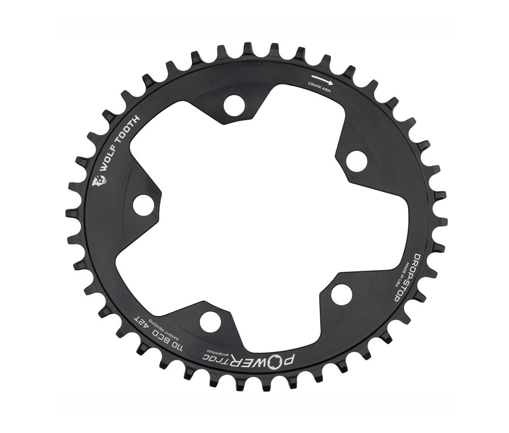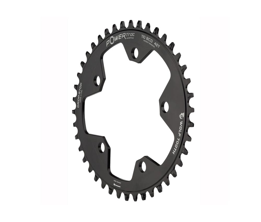 Das ovale 1-fach Kettenblatt wurde speziell fuer den Umbau von Road, Gravel, CX Kurbeln und Powermeter mit symmetrischen 110 mm Lochkreis entwickelt. Damit lassen vorhandene Kettenblatt Kombinationen auf 1-fach Antrieb umruesten, was Gewicht spart und fuer eine aufgeraeumte Optik sorgt. Durch die PowerTrac Technologie ist das Kettenblatt 10 Prozent Oval und mit weniger aggressivem 112 Grad Timing ausgestattet. Es ist mit allen 9-11-fach Ketten aller Hersteller und 12-fach Ketten von Sram, Campagnolo, KMC, Connex, Wipperman kompatibel.