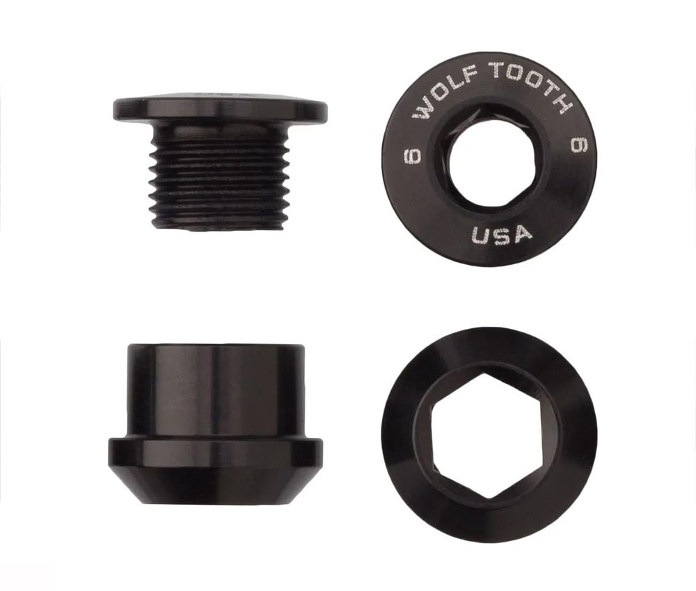 Die Wolf Tooth Kettenblattschrauben mit M8 Gewinde, in 6 mm Laenge, wurden fuer 1-fach Kettenblaetter ohne Gewindebohrung und der Montage an Kurbeln mit 4-Arm Befestigung entwickelt.